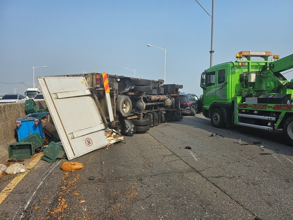 출근길 '김포한강로 전면통제' 왜?…차선 변경 중 사고, 3톤 트럭 뒤집혀