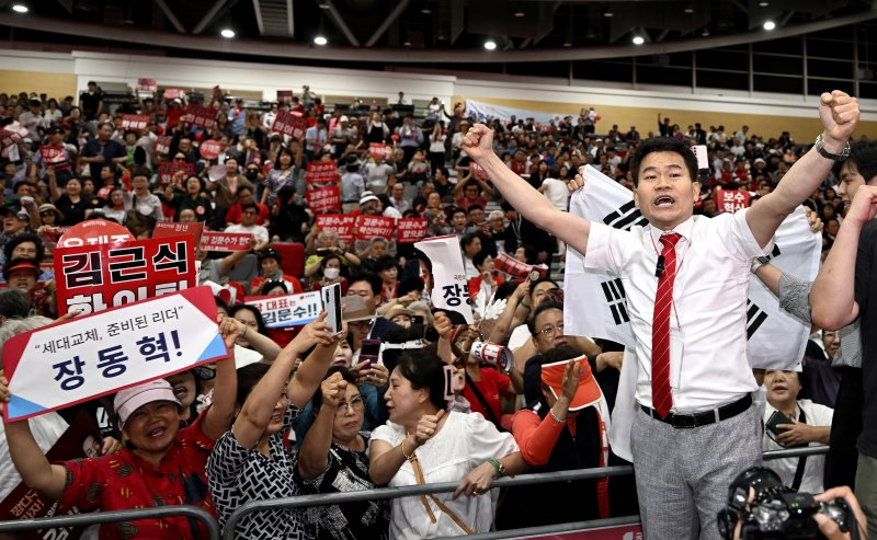 전한길 한국사 강사가 8일 대구 북구 엑스코에서 열린 국민의힘 제6차 전당대회 대구·경북 합동연설회에서 특정 후보를 지지하며 찬탄(탄핵 찬성)파 후보가 등장할 때마다 ‘배신자’란 구호를