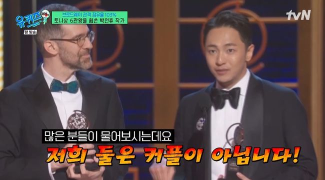 [OSEN=박소영 기자] 뮤지컬 '어쩌면 해피엔딩'의 박천휴 작가가 콤비 윌과의 커플 의혹(?)을 부인했다. 2일 방송된 tvN '유퀴즈 온 더 블럭' 300회 특집에서 토니상 6관왕을 휩쓴 박천휴 작가는 "한국