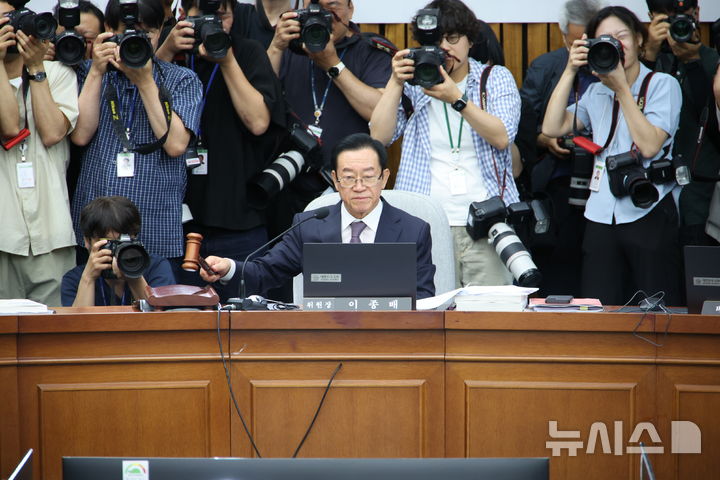 [서울=뉴시스] 김금보 기자 = 이종배 국회 김민석 국무총리 후보자 인사청문특별위원장이 24일 서울 여의도 국회에서 열린 김민석 국무총리 인사청문회에서 의사봉을 두드리고 있다. 2025.06.24. kgb