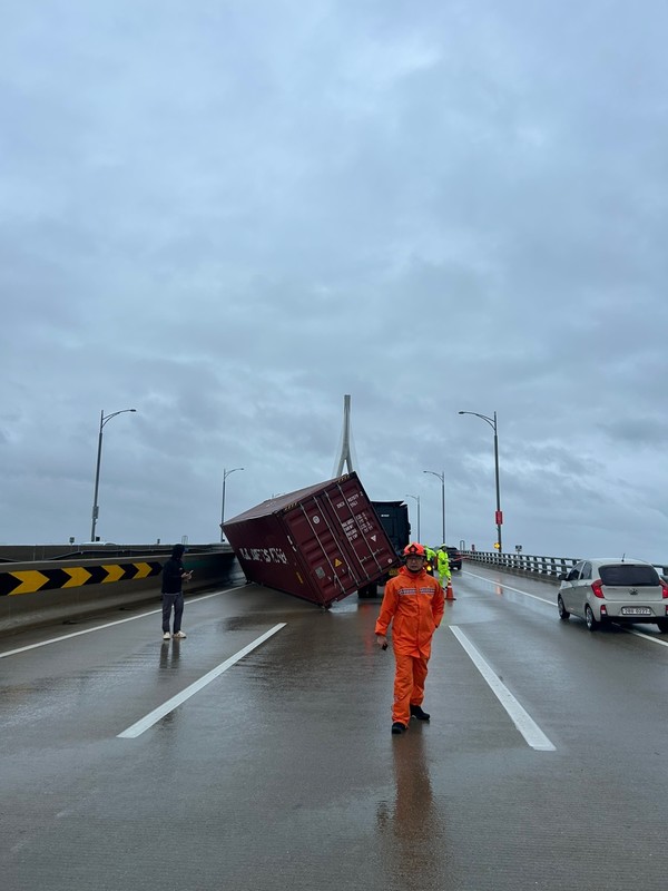 강풍에 인천대교 달리던 트럭서 컨테이너 낙하