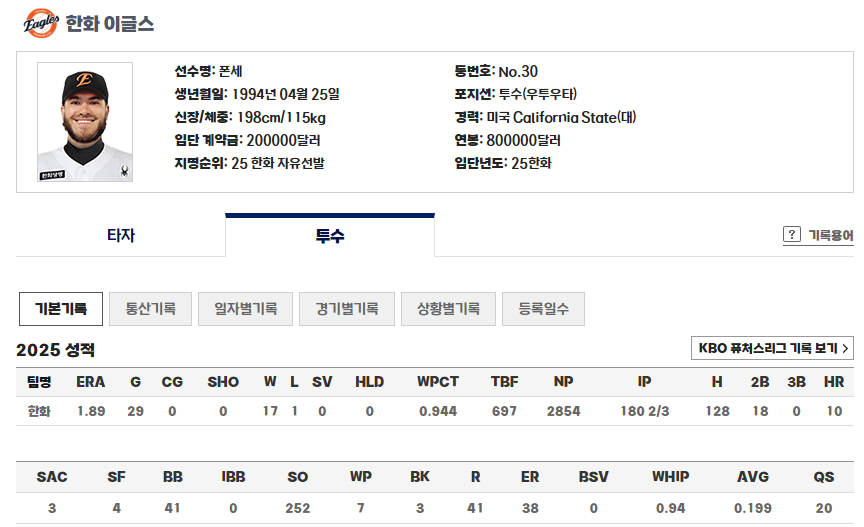 폰세는 2025년 정규시즌에서 평균자책점 2점대, 승률 0.800 이상, 그리고 다승과 탈삼진 부문 상위권을 기록했습니다. 특히 KBO 리그에 진입한 외국인 투수 중에서도 높은 완투율을 자랑하며 한화 마운드의 중심을 지탱하고 있습니다.