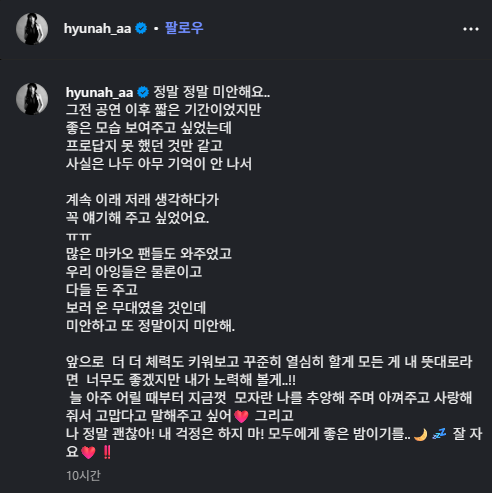 지난 9일 마카오 아웃도어 퍼포먼스 베뉴에서 열린 '워터밤 2025' 무대에서 현아실신 사고가 발생했습니다. 히트곡 '버블팝' 공연 도중 갑자기 의식을 잃고 쓰러진 현아는 놀란 백댄서와 스태프의 도움을 받아 경호원이 무대에 올라 들것처럼 안아 무대 뒤로 퇴장하는 장면이 포착됐습니다. 현장 영상을 접한 관객과 팬들은 현아쓰러짐을 보고 큰 충격을 받았고, 이후 현아는 SNS에 직접 사과문을 올려 현아기절 당시의 상황을 전하며 “아무 기억이 없다”고 밝혔습니다. 현아마카오 공연 중 벌어진 이번 사건은 빠르게 확산되며 팬과 언론의 주목을 받았습니다.